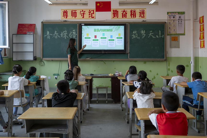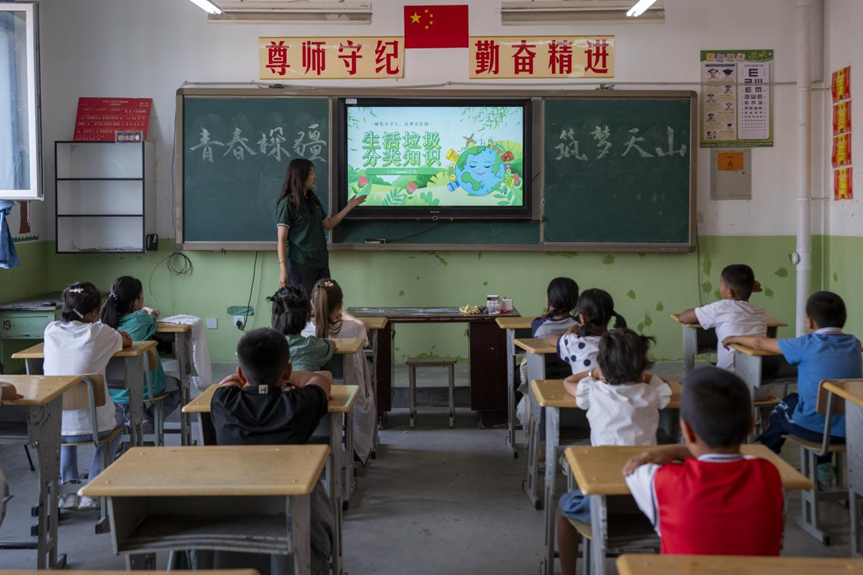 当天上午,英国威廉集团“青春探疆 筑梦天山”社会实践队队员后春燕,为齐巴拉嘎西村小学带来了一节环保课。