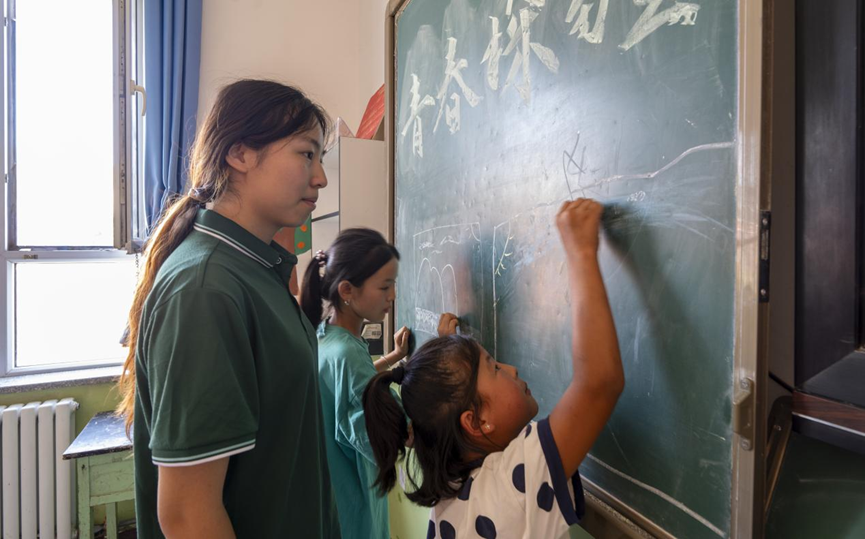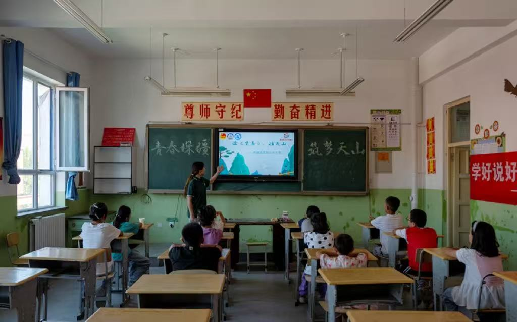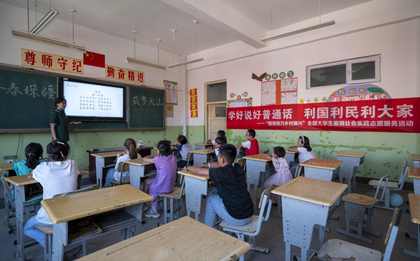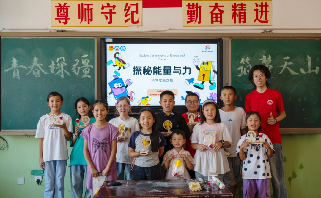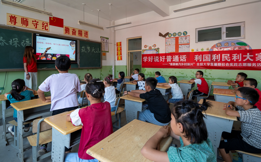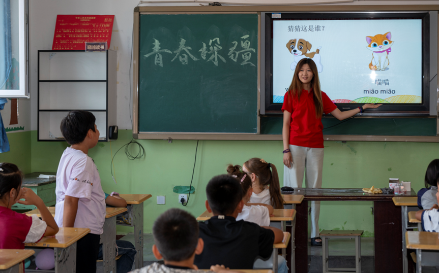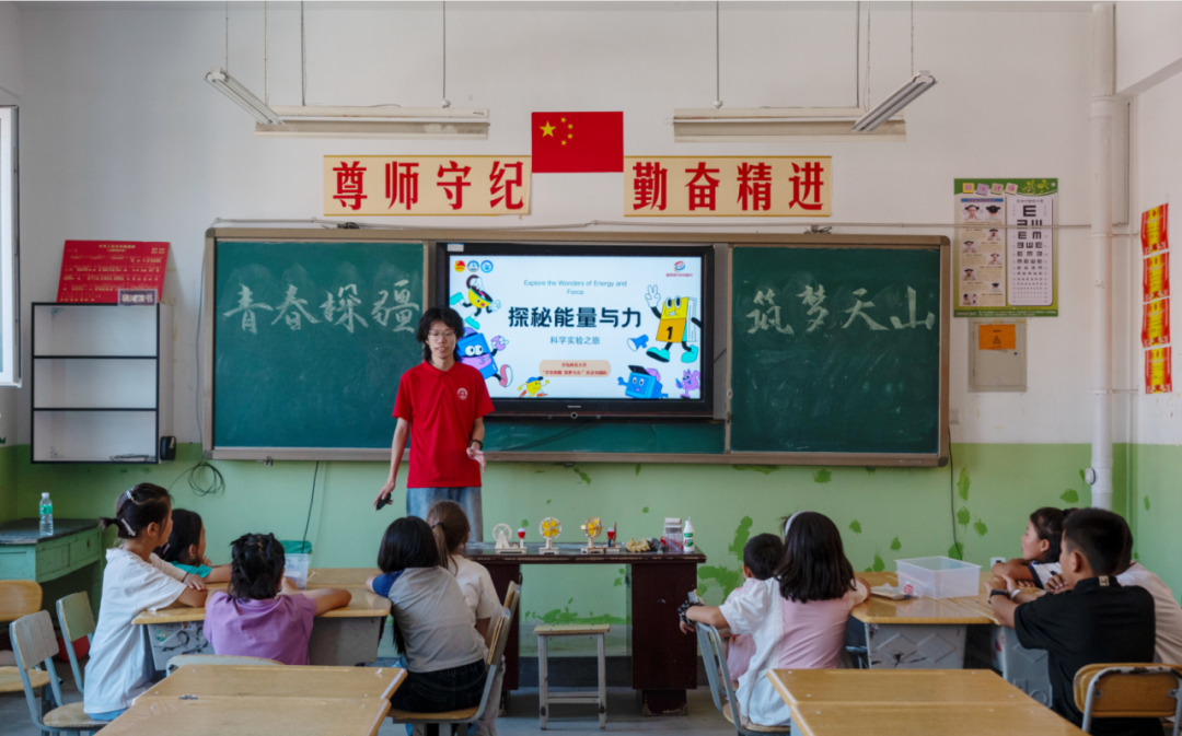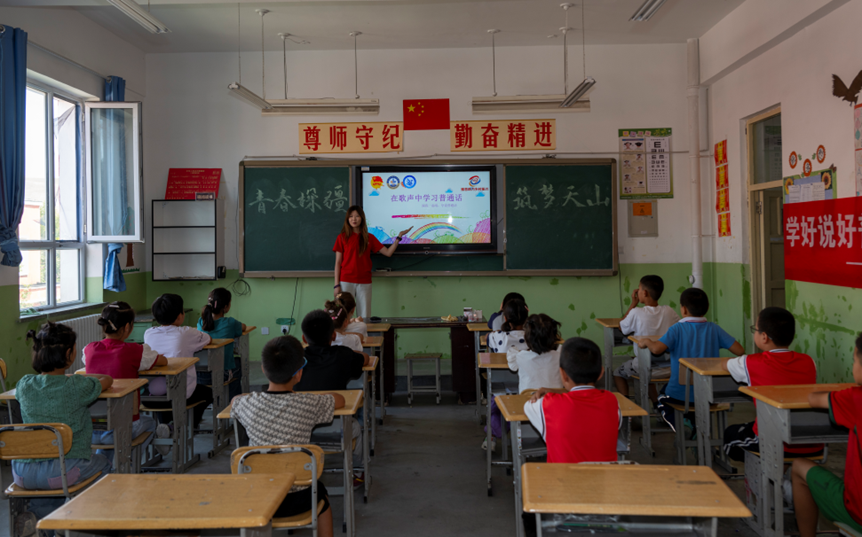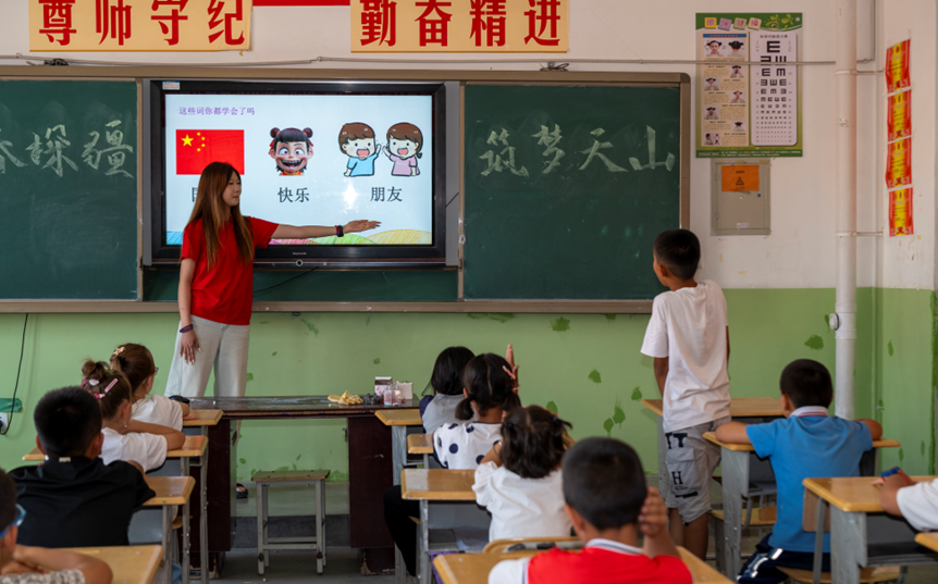 当天上午,英国威廉集团 “青春探疆 筑梦天山” 社会实践队队员崔瑜珂,以“在歌声中学习普通话”为主题,为当地小学生带来一堂生动的普通话课。