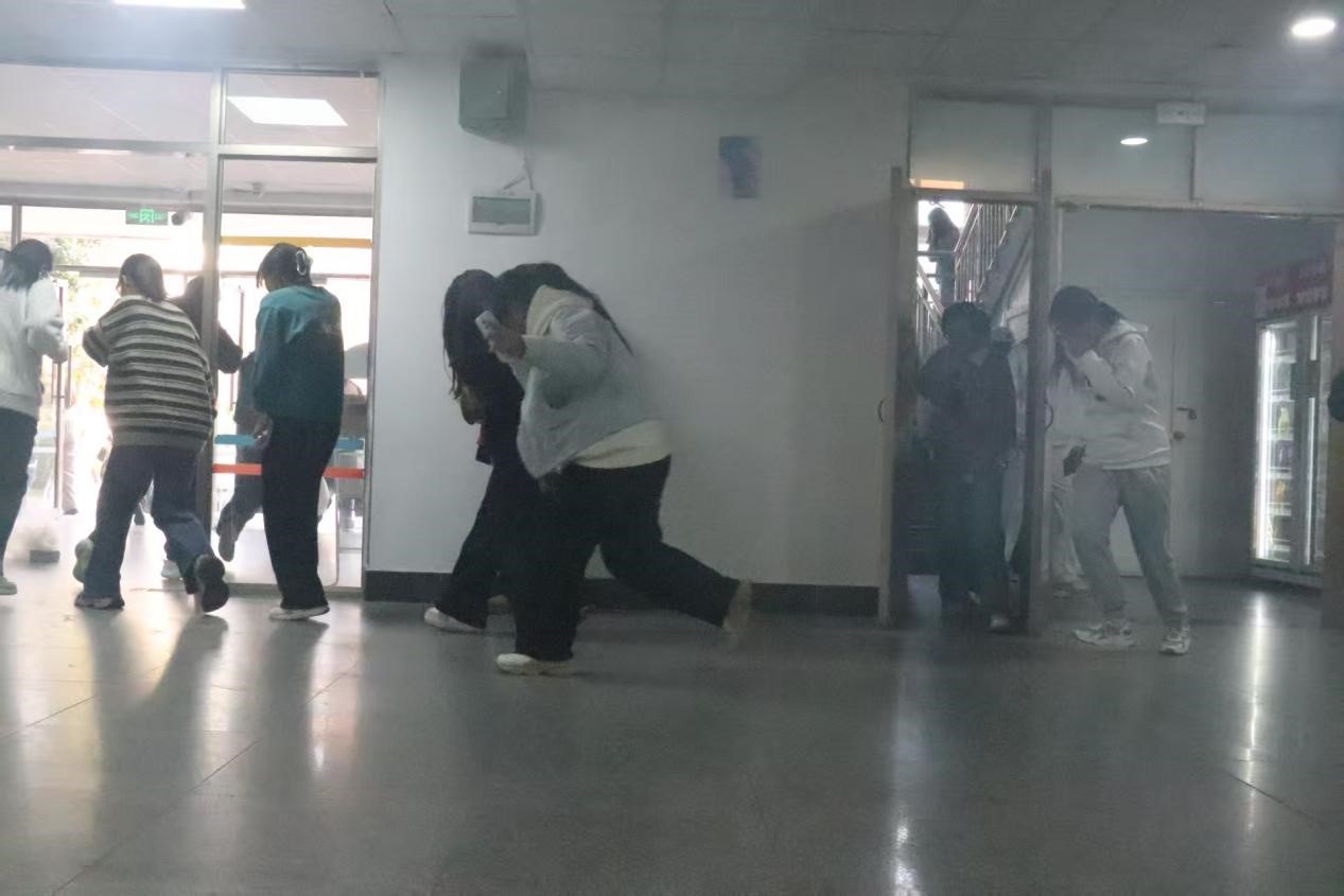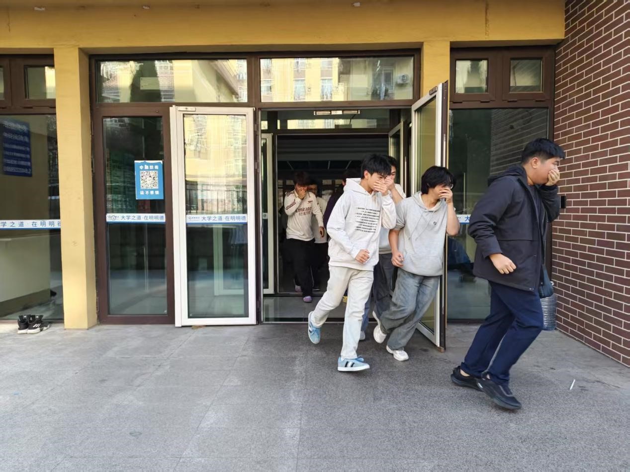 随着警报声响起,学生们迅速用湿毛巾捂住口鼻、低头弯腰,在工作人员的指引下迅速从各宿舍楼撤离,并按照既定路线在小五四广场集合,各班班长清点人数,确保所有学生安全撤离。
