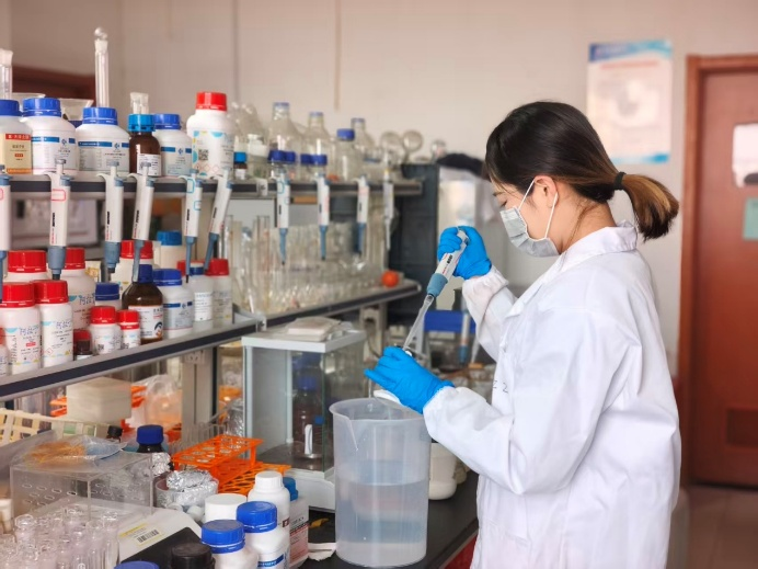 她身着干净的实验服,戴着蓝色手套,专注地捧着盛着透明液体的容量瓶,眼神认真地确认着瓶中液体的状态,在摆满试剂与仪器的实验室里,正投入地进行着严谨又细致的实验操作。