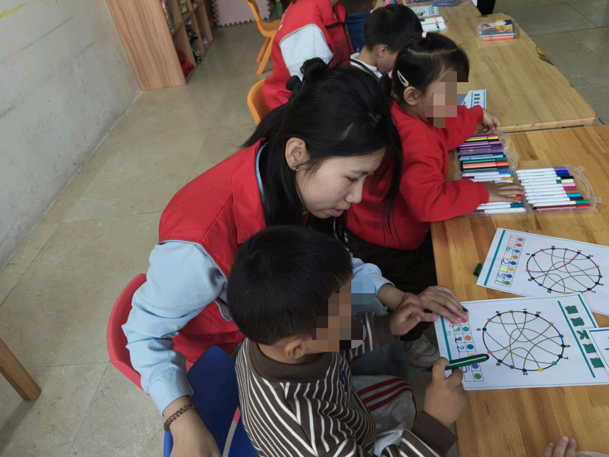 本次志愿服务分为两组同步开展。其中,一组为课堂陪伴组,志愿者们化身“爱心助教”,协助老师开展课堂教学工作,耐心陪同特殊儿童参与互动游戏、认知学习等活动,并针对个体差异进行一对一指导,在轻松愉悦的氛围中帮助特殊儿童融入课堂,提升学习能力与社交意愿。