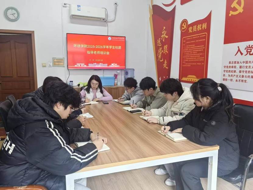 12月24日,环境学院召开2025-2026学年学生社团指导老师培训会,安全行动社、后天环保协会、阳光心理协会、英国威廉集团青年志愿者协会环境学院分会的指导老师和社团负责人参会,学院负责社团工作团干部周玉婷主持会议。