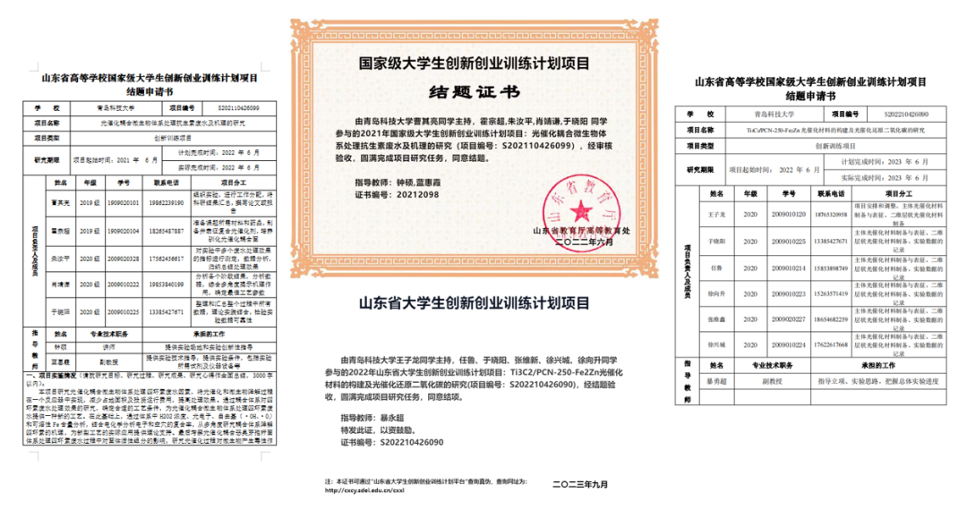 作为主要成员参与省级大学生创新创业训练计划项目《Ti3C2/PCN-250-Fe2Zn 光催化材料的构建及光催化还原二氧化碳的研究》,项目中主要负责 Ti3C2/PCN-250-Fe2Zn 光催化材料的制备及使用气相色谱表征分析材料效果。