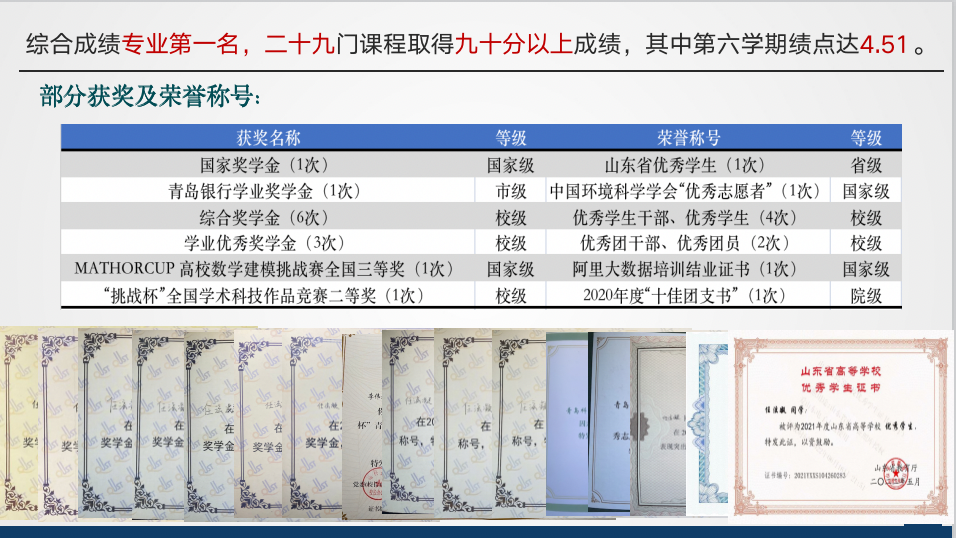 前六学期综合成绩专业第一名,二十九门课程取得90分以上成绩,其中第六学期绩点达4.51。获国家奖学金,一等综合奖学金等各类综合奖学金共6次,学业优秀奖学金3次,青岛银行学业奖学金,“海科环保”创新实践一等奖学金等多项省级、校级奖学金。获山东省优秀学生,校级优秀学生干部、优秀学生、优秀团干部、优秀团员称号,学院“十佳团支书”等荣誉称号15余次。以专业第一的成绩获得学校推免资格,取得天津大学、西安交通大学、山东大学、中南大学、中国农业大学、中国科学院大学杭高院、中国石油大学(北京)、江南大学、北京林业大学等十余所985、211院校的offer,最终选择推免至天津大学攻读硕士研究生。