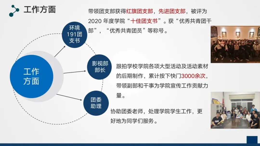 担任环境 191 团支部书记、团委助理,曾任学院新媒体中心影视部部长。