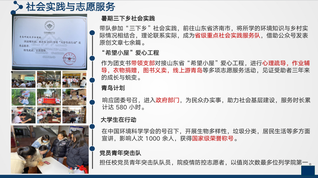 作为团支书带领团支部对接山东省“希望小屋”爱心工程,团支部累积服务时长达500多小时。积极响应团委号召,两次参加“青鸟计划”,进入民政局、医保局等政府部门,为民众办实事,助力社会基层建设,服务时长累计达 580小时。