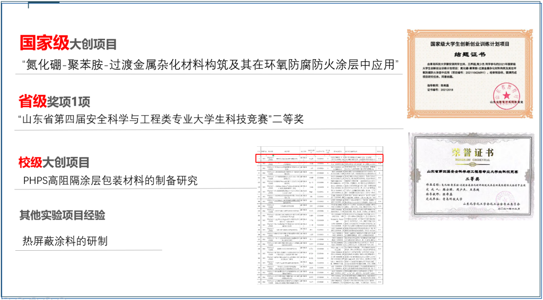 2021年,作为核心成员参与国家级大创项目“氮化硼—聚苯胺—过渡金属杂化材料构筑及其在环氧防腐防火涂层中应用”,并已于今年6月顺利结题。