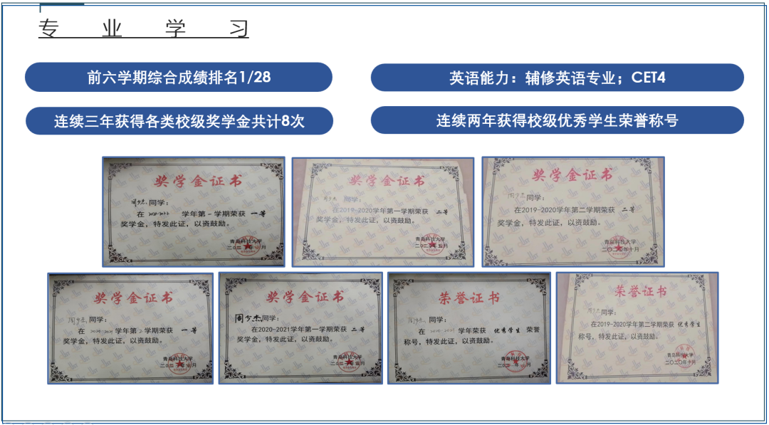 相关奖项:连续三年获得各类奖学金共计8次:校内一等综合奖学金3次二等综合奖学金3次学业优秀奖学金1次院2021年度创新实践奖学金连续两年获评校级优秀学生。